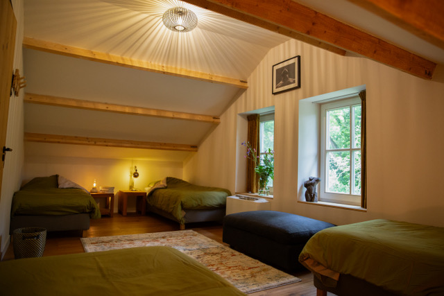 Naast yoga en mindfulness is er tijdens het weekend voldoende ruimte voor vrije tijd. Je kunt in de directe omgeving prachtige wandelen en ook kun je afkoelen in de natuurlijke zwemvijver direct bij de accommodatie of binnen of buiten een rustig plekje opzoeken om te ontspannen met een boek of gewoon in stilte.