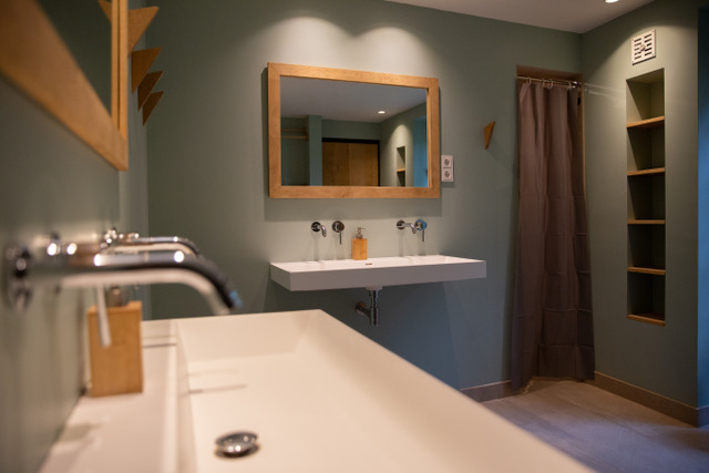 Gedeelde grote badkamer ‘Van Buiten naar Binnen’ retraite – 2 aparte doucheruimten voorzien van douchegordijn + 2 grote wastafels met elk 2 kranen